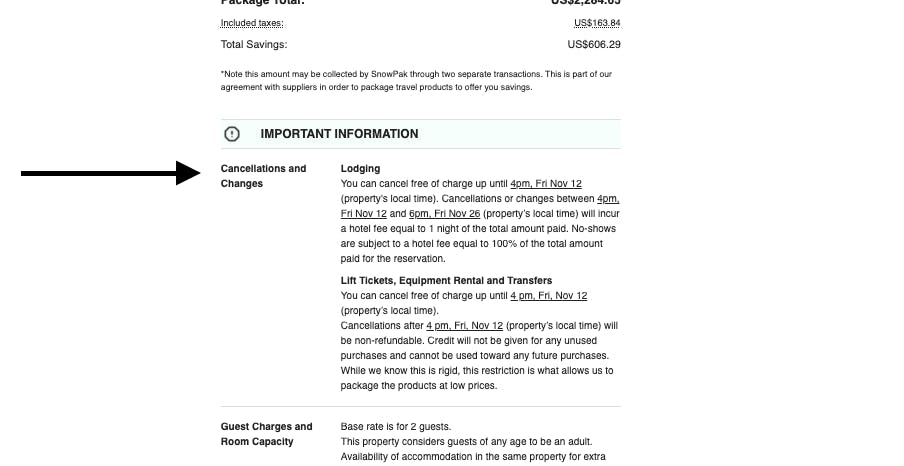 1. Confirmation Page: Once payment is processed and booking confirmed, the Cancellation Policy can be located under Lodging section or at the bottom of the confirmation page.