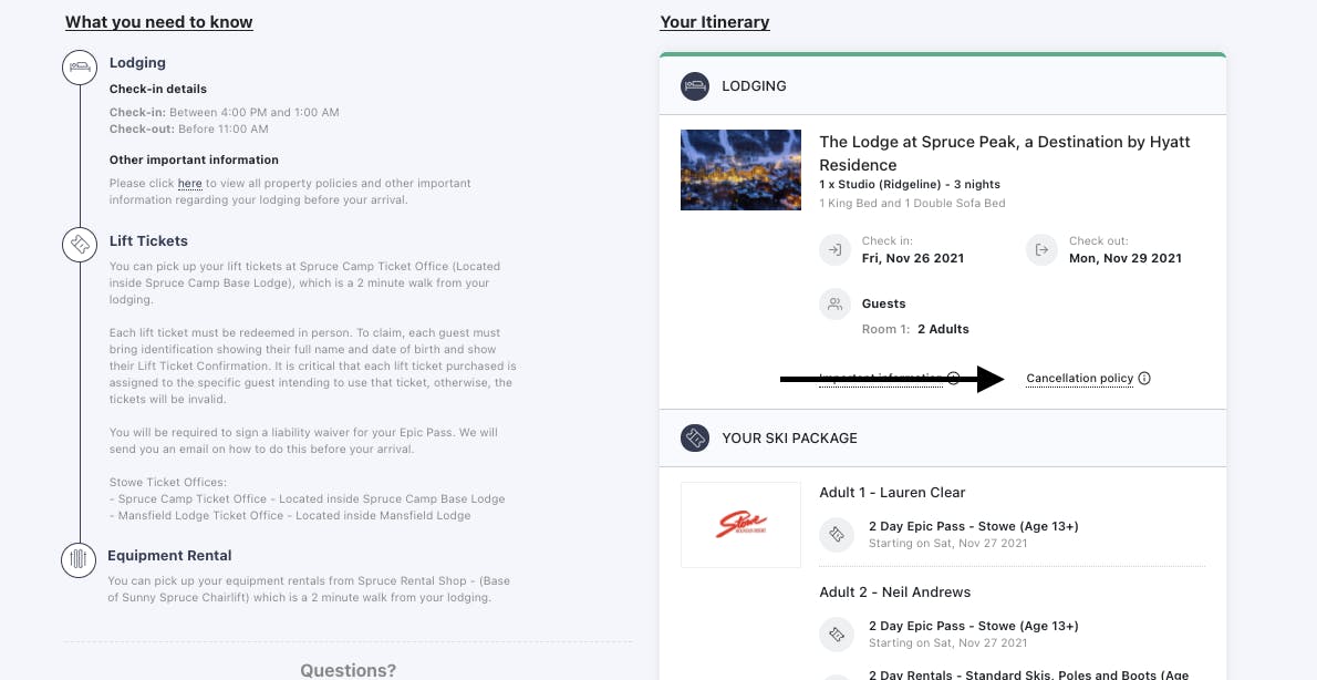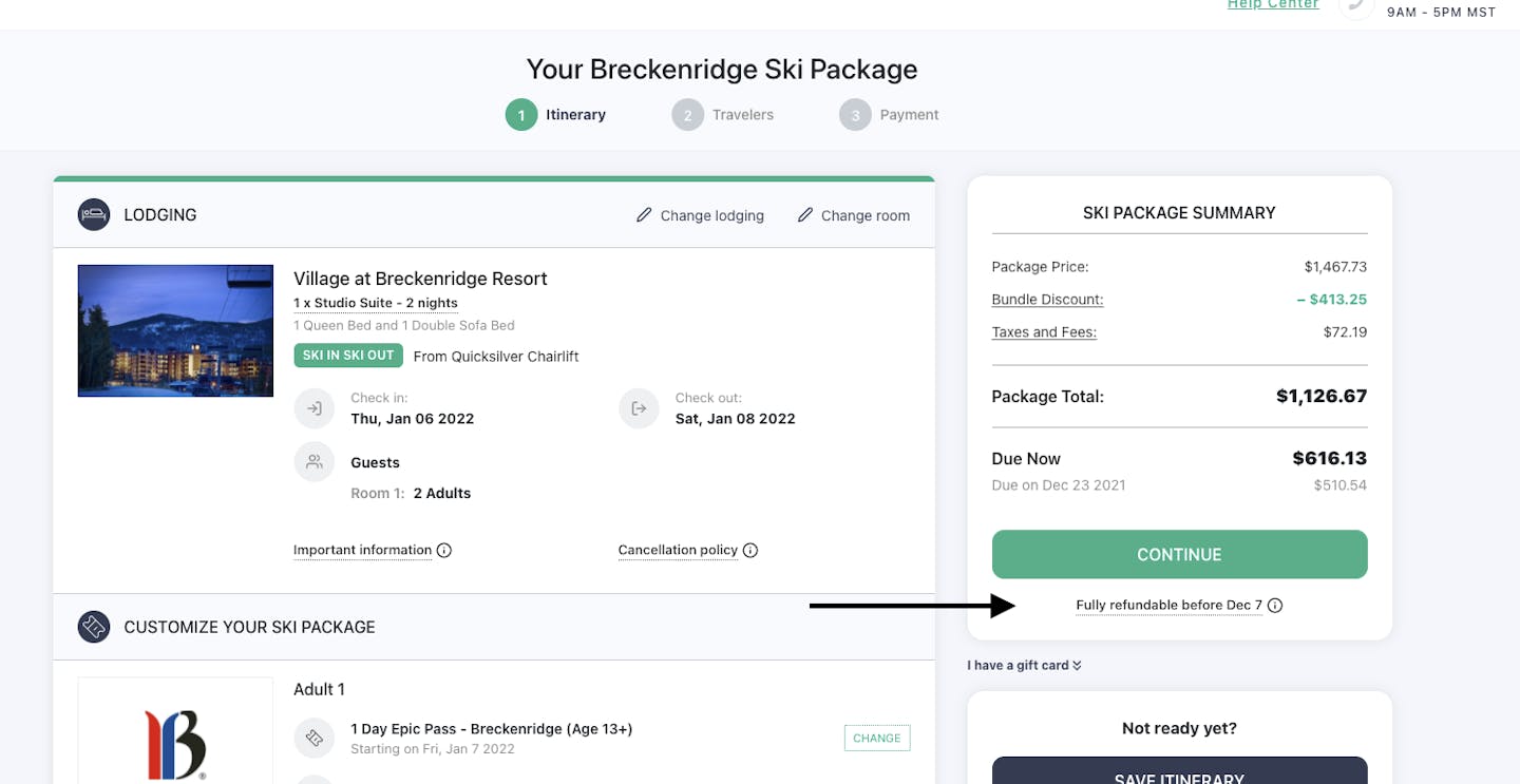 2. Itinerary, travelers and payment Page: Once you have proceeded to Itinerary page, the Cancellation Policy can again be accessed under Ski Summary section.